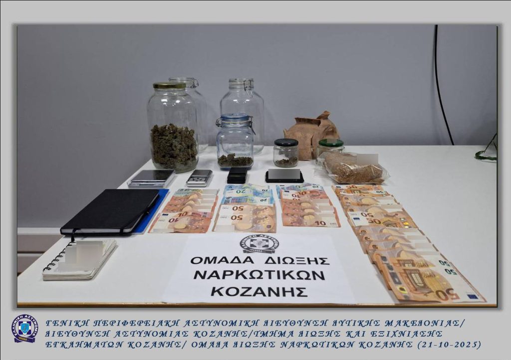 Επιπλέον, σε βάρος του ανωτέρω σχηματίσθηκε δικογραφία κακουργηματικού χαρακτήρα για διακίνηση ναρκωτικών ουσιών Μεταξύ άλλων, κατασχέθηκαν τμήματα πήλινου αμφορέα, ποσότητες ακατέργαστης κάνναβης και αδασμολόγητου καπνού, -3- ηλεκτρονικές ζυγαριές ακριβείας, καθώς και το χρηματικό ποσό των -1.150- ευρώ κ.α.Μετά από συντονισμένη επιχείρηση αστυνομικών της Ομάδας Δίωξης Ναρκωτικών του Τμήματος Δίωξης και Εξιχνίασης Εγκλημάτων Κοζάνης, συνελήφθη, χθες (20-10-2025) τις μεσημβρινές ώρες σε περιοχή της Κοζάνης, 28χρονος ημεδαπός, σε βάρος του οποίου σχηματίστηκε ποινική δικογραφία, για παράβαση της νομοθεσίας περί προστασίας αρχαιοτήτων και εθνικού τελωνειακού κώδικα, καθώς και για διακίνηση ναρκωτικών ουσιών.